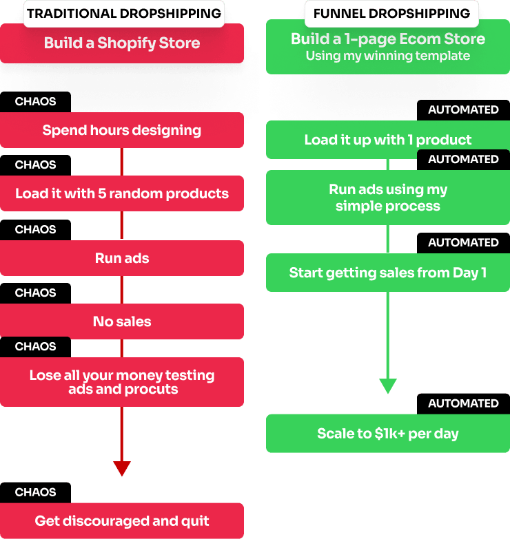 Where instead of doing what everyone else is doing, like building ugly Shopify stores with 20 different products and burning all your cash on failed ads – we focus on selling one winning product by building a simple 1-page store that takes less than a day to create…